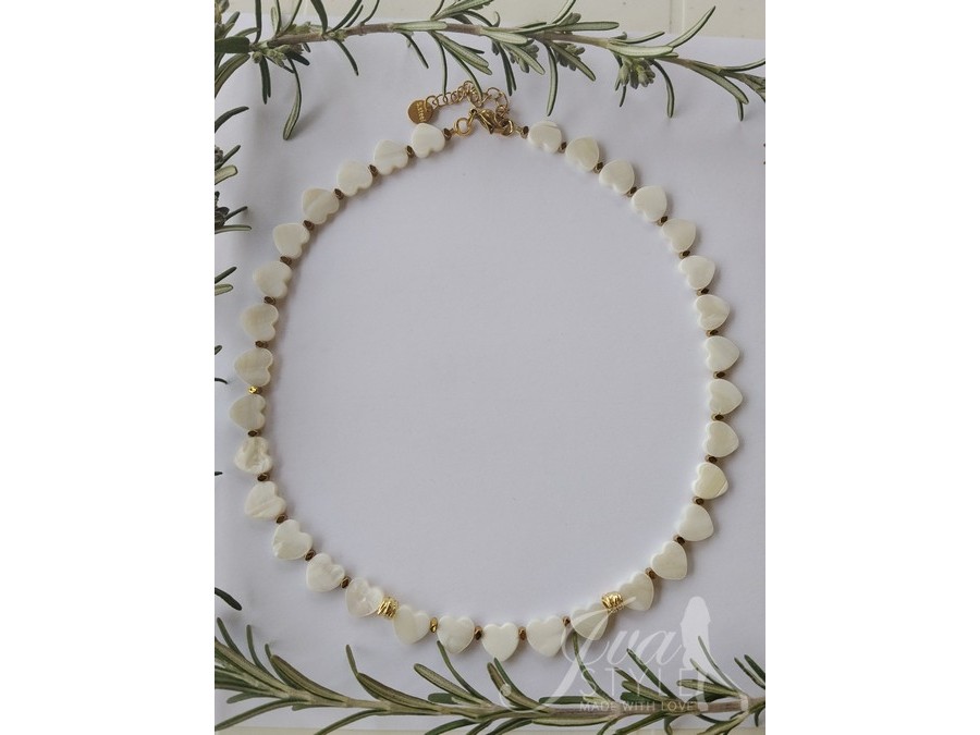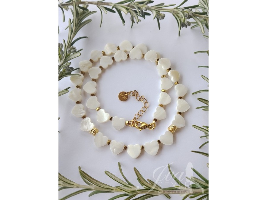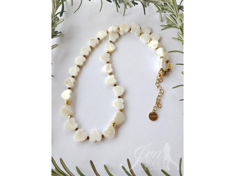 Kratka ogrlica od školjki u obliku srca, nerđajućeg čelika i poludragog kamena- hematita. Veoma elegantna ogrlica, koja se može nositi i svakodnevno.