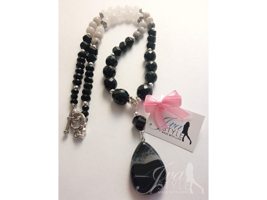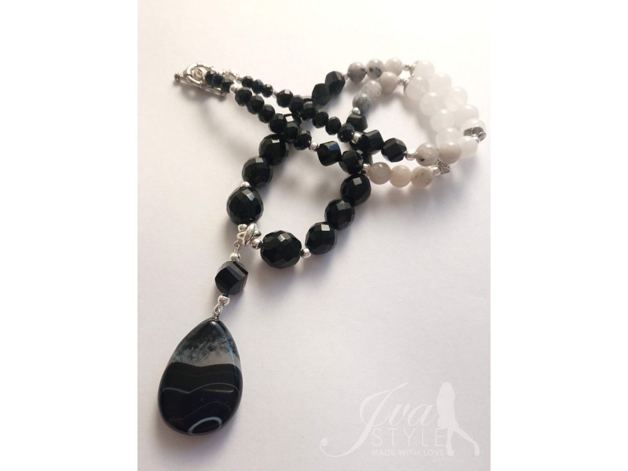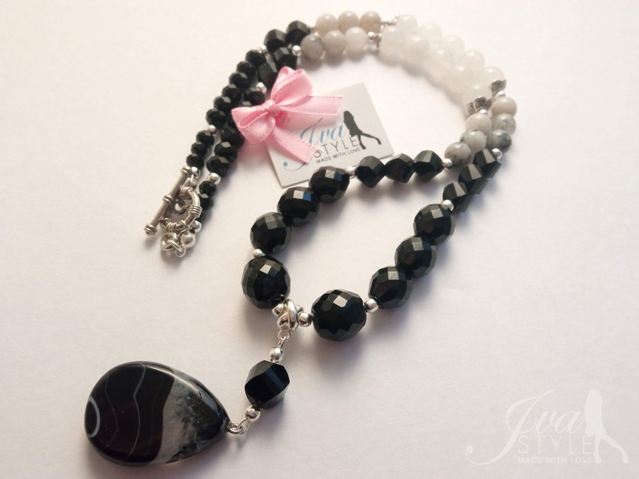Izrađena je od crnih čeških perli, belog žada, rutilkvarca staklenih perli većih i manjih. Na sredini ogrlice nalazi se privezak od poludragog kamena- ahata.