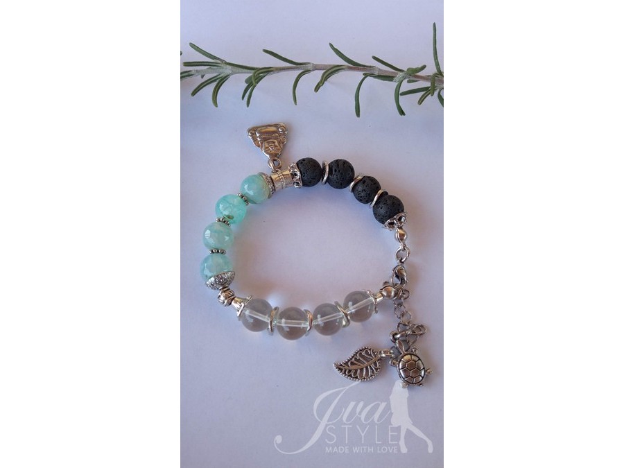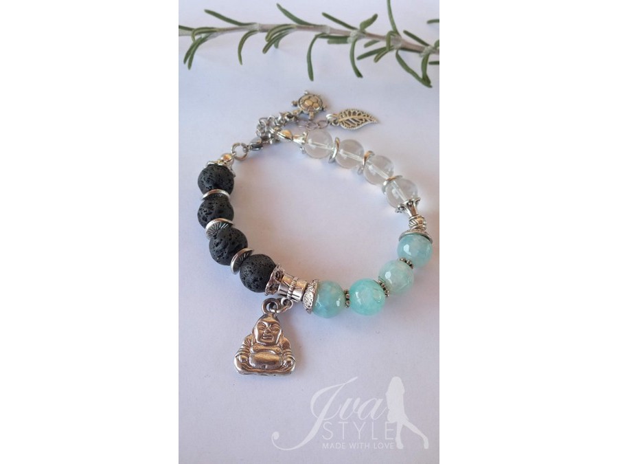 Izradena je od poludragog kamenja-ahat, vulkanska lava i gorski kristal. Ukrašena je elementima od nerdajuceg čelika i tibetanskog srebra. Na sredini narukvice nalazi se privezak.